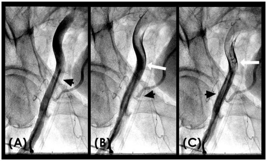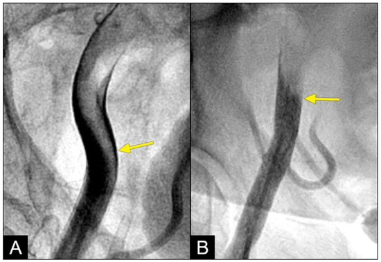 ANTEGRADE blood flow: With the novel angiographic technique, in the iliac artery, during systole, the blood in white color was recorded moving forward on a black background of contrast. The blood moved in an antegrade direction secondary to the positive pressure gradient generated by the contraction of the left ventricle (LV), resulting in higher pressure in the aorta in comparison to lower pressure in the distal peripheral arteries. In the iliac artery, the flow could be laminar or non-laminar and of entry type (Figure 4A,B).
