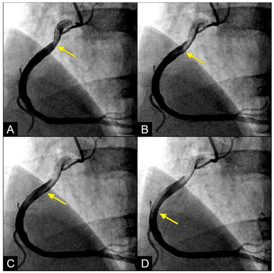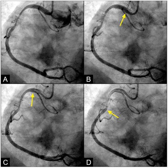 (A,B) Laminar flow. These four coronary images are in consecutive sequence. (A) This is the angiogram of the right coronary artery (RCA), which is filled with contrast (in black). (B) The blood (in white) is seen well organized with a sharp border and a pointed tip, curving along the apex (yellow arrow). (C,D) The blood (in white) is seen following the apex of the curves (yellow arrow). This is the laminar flow following the curves in a helical fashion.