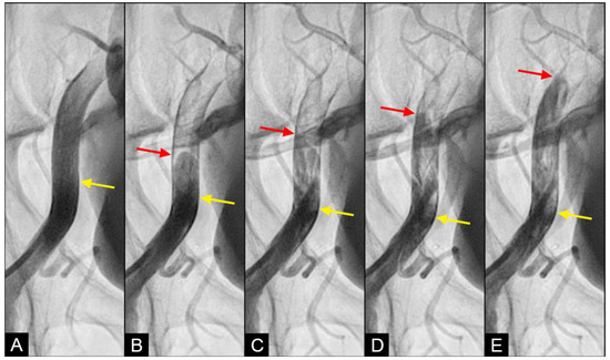 (A–D) Interface of the collision between the antegrade blood flow and the retrograde contrast flow. These figures are in consecutive sequence. The antegrade flow represents the systolic contraction, while the diastolic contrast flow represents the exaggerated peripheral vascular resistance. (A) The blood advances with a soft, vague tip (yellow arrow). (B) Then, 0.067 s later, the retrograde flow begins to form, slowly pushing upwards (red arrow). (C–E) At the same time, the antegrade flow moves forward slowly (yellow arrow). At the interface, the proximal end of the retrograde flow has a round curve shape suggestive of a soft interaction with the antegrade flow (red arrow). The blood in white still flows forward at a slower pace (yellow arrow), while the retrograde flow moves upwards (red arrow).