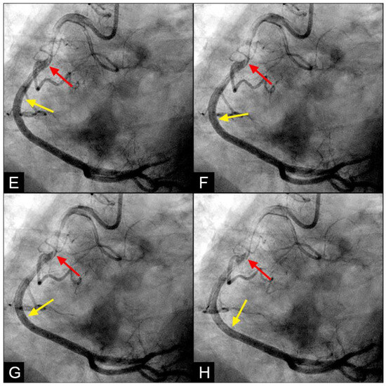 In the right coronary artery (RCA), with the novel angiographic technique, during diastole, the antegrade flow was clearly illustrated (Figure 9A–D). The leading edge of the flow was sharp, suggestive of laminar flow (Figure 9C). The speed in diastole was fast, as the blood could traverse from the end of the proximal segment to halfway through the mid-segment in just 0.067 s, equivalent to one image interval (Figure 9D). At this junction, at the onset of systole, the antegrade flow decelerated (yellow arrow), while the mixed black contrast persisted at the location of the transition from diastole to systole (red arrow). This contrast remained until near the end of systole, providing visual evidence of disorganized flow secondary to the interaction between the retrograde and antegrade flows; most likely, it was a collision (Figure 9E–H) (Video S2).