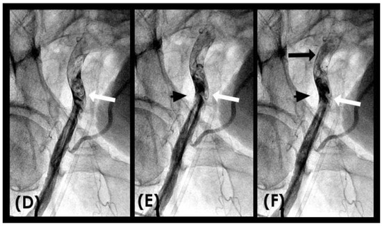 VORTEX formation and degeneration: With the novel angiographic protocol, we observed the following phenomena in the iliac artery during systole: At first, the blood (depicted in white) flowed in an antegrade direction, exhibiting a pointed tip of laminar flow that followed the apical curve of the artery (white arrow) (Figure 10A,B). Subsequently, the pointed tip of the blood flow halted abruptly, with all layers recoiling like a collapsing stack of dominoes (white arrow) (Figure 10C). The tip of the flow then twisted and turned on itself, resembling a vortex (white arrow) (Figure 10D). Sixty-seven milliseconds later, this motion dissipated and was replaced by a mass of black contrast (arrowhead) moving in a retrograde direction along the inner curve (Figure 10E). This black contrast mass gradually expanded, indicating the superior strength of the retrograde flow (Figure 10F). The sharp interface between the blood (white) and the contrast (black) suggested a soft contact between the two liquids (Video S3).