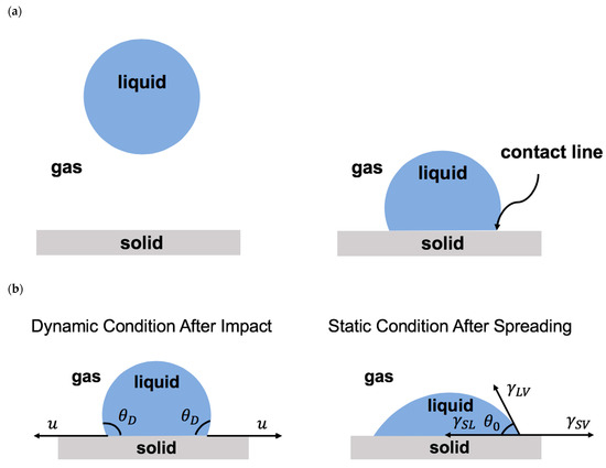 Once a droplet touches a solid surface, the contact line forms where the solid, liquid, and gas phases coexist (Figure 3a). After impact, the contact line moves on the solid surface. The level of contact line advancement on the solid surface is known as wettability. Wettability depends on the relative significance of the adhesive and the cohesive forces along the contact line [2,4,6,9,10,12,14,15,32,33,45,50,199,249,250]. The adhesive force promotes droplet advancement, whereas the cohesive forces resist the contact line motion. The physics of the moving contact line is important in various scientific fields, such as coatings, printings, microfluidics, energy, healthcare, and medicine [2,4,6,9,10,12,14,15,32,33,45,50,199,249,250,255,256,257,258,259,260,261,262,263,264,265,266,267,268].