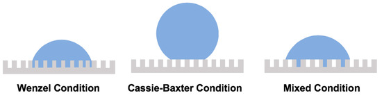 Schematics of droplet situation according to three physical models: Wenzel model, Cassie–Baxter model, and mixed model (i.e., combination of Wenzel and Cassie–Baxter models).