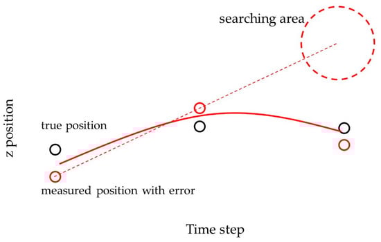 Low positional accuracy leads to a low vector acquisition rate in the following ways. As the velocity is calculated by dividing the particle movement by the time width of an image, it is necessary to link (i.e., track) the same particles in successive images. The tracking of particles adopts historical information on the particle position. Figure 1 shows moving particles and positional data, including errors for the z direction. Black circles indicate the correct positions, and red circles the measured positions with error. The particle position at time t + 1 is estimated from the particle positions at times t − 1 and t. The particle inside the estimated area (i.e., the dotted circle in Figure 1) is recognized as the same particle. However, a particle outside the search area cannot be tracked. A smaller movement in one-time step corresponds to a greater ratio of the position error to the amount of movement and a higher chance of tracking failure. Even if a slowly moving particle could be tracked, the accuracy of its velocity would be low. To reduce mistracking, in the example of the four-time-step method [], a particle is judged to be the same if it is tracked in four consecutive images. However, although the four-time-step method, velocity gradient tensor method [], and other methods are used to track particles, they cannot track particles in the described error-prone situations.