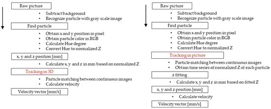 Figure 2 presents flowcharts of data processing. The left flowchart is for the conventional 3D tracking method, whereas the right flowchart is for the in-picture tracking method proposed in this paper. First, the background is subtracted from the measured image, and the particles are identified on the grey scale. Then, particles are identified from the raw image, and their xy position in the pixel and particle color space are extracted. The particle color is converted from RGB to the hue degree and then to the normalized z position using a calibration curve. The hue degree (H) is calculated from the values of the three color channels [] according to