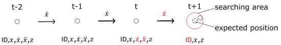 The process involves four operations, as shown in Table 1. First, process 1, as the basic tracking process, predicts the position at t + 1, assuming that the velocity and acceleration at t − 1 are maintained at t, from the positional information at t − 2 and t − 1 for the particle that has been assigned an ID at t. The particles within the search area are filtered using the dimensionless z positional information obtained from the color information, e.g., by taking ΔZ < 0.025. If a particle exists within the predicted range, the particle is linked as the same particle and given an ID, and the velocity and acceleration at time t are calculated. Filtering by z is performed in the same way in subsequent processes. This threshold value of ΔZ must be greater than the distance moved in the depth direction for one step plus the error of color-depth transformation. This is to be the same as setting the search range in the xy direction. In previous studies, the error width (95th percentile width) has been around 2%, and research is underway to reduce this further []. So, the threshold value should thus be set according to the velocity of the measurement target and sampling rate.