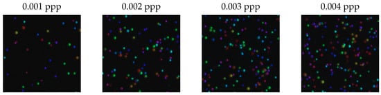 An acryl container having inner dimensions of 300 × 300 × 300 mm3 is filled with particle extended water. The Diaion HP20 tracer particles (Mitsubishi Chemi) have a density of 1.01 g/cm3, and their diameter is controlled to be within the range of 350–600 μm through sieving. The particle number density (particles per pixel, ppp) is evaluated from the captured image. The density cannot be correctly evaluated under dense conditions because overlapping particles cannot be accurately recognized. Therefore, we adopt a dilute condition with few overlapping particles as a standard, and we control the particle number density under a dense condition by mixing several times the dilute number of particles into the particle mixture. The particle concentrations are 0.001, 0.002, 0.003, and 0.004 ppp. Sample images for the different conditions are shown in Figure 5. A rotating disk with a diameter of 200 mm generates a circular flow in a container. The rotational speeds are 60, 120, 180, and 240 rpm, and the corresponding maximum movements in the image (i.e., the initial search areas) are 25, 40, 45, and 60 pix. The search area for the predicted position is uniformly set at 5 pixels. Incidentally, most particles are less than 10 pixels in diameter. Moreover, tracking in 3D space is almost impossible under such strict conditions. The search range for the predicted position is, therefore, set at one-fifth of the distance moved (in millimeters) in the previous step.