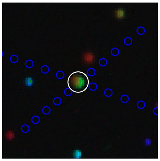 Figure 6 shows an example of the compensation process for a lost particle. The figure shows a cropped image of 100 × 100 pix, with two overlapping particles at the center indicated by a white circle. The overlapping particles are seen as a single particle having a color different from that of the particles before and after, and the tracking is thus disconnected. The blue circles indicate the positions of the two particles, five steps before and five steps after. The positions of the two particles at the overlap time are estimated from the particle positions at the times before and after. The IDs of the particles are taken from before and after the overlap and considered to label the same particles.