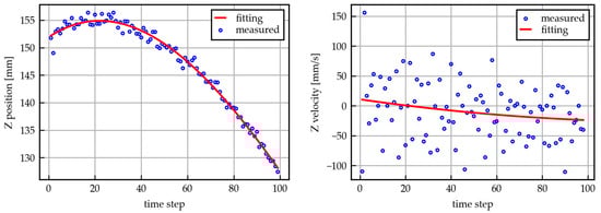 Next, an example of complementation by polynomial approximation is shown, where the low accuracy of the depth position estimated from particle colors is complemented by approximating the particle trajectory with a third-order polynomial, as in [,].