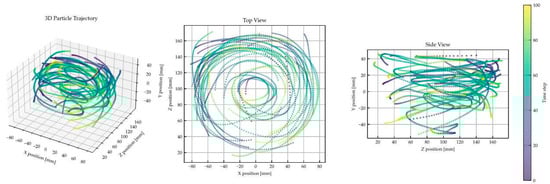 Figure 8 shows sample results of the particle trajectory of rotational motion in 3D, XZ, and ZY 2D coordinates as the demonstration. The particle number density is 0.003 ppp, and the disk rotating speed is 180 rpm. Results are shown for 100-time steps but with a moderately reduced number of particles for visibility.