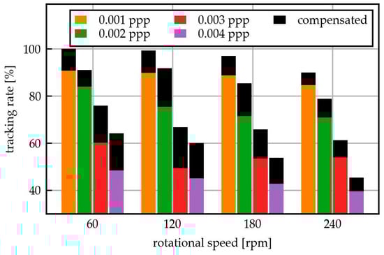 Figure 10 shows the particle tracking rates for different particle densities and disk rotational speeds. Tracking rates achieved using the in-picture method are indicated by the colored sections of bars, and further increases in the tracking rate due to compensation are shown by the black sections of the bars. If there is particle overlap, the number of particles cannot be accurately determined from an image. Therefore, as there is almost no overlap at a particle density of 0.001 ppp, the number of particles is estimated by suspending an equal number of particles based on the number of particles recognized under this condition.