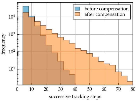 A polynomial fitting process is required to obtain the velocity vectors, and therefore, particles that are tracked continuously for a certain number of steps are needed. Figure 11 shows the frequency of successive tracking steps before and after the compensation process. The sample data are the same as those in Figure 8 and Figure 9 under the condition of 0.003 ppp and 180 rpm. In this study, the continuous track required for fitting is 10 steps. The compensation process reduces the frequency of occurrences below 10 steps and generally increases the number of continuous tracking steps.