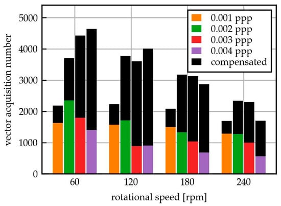 Figure 12 shows the velocity vector acquisition number for different particle densities and disk rotational speeds. As in Figure 11, the results obtained using the in-picture method are indicated by the colored sections of bars, and the improvements due to compensation are shown by black sections.