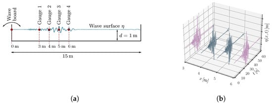 For the data generation, we maintained a fixed water depth of and employed four virtual wave gauges to provide time-series measurements along the water surface at , which constituted a typical depth and measurement point spacing in educational wave tanks [47,48]. The outer gauges of the numerical wave tank were designated as locations of sparse measurements () for the PINN training, while measurements at the inner gauges () were solely used to assess the PINNs’ performance against a ground truth after the training process. We generated a temporal wave surface elevation series over an interval that spanned t = 0–60 to ensure that the wave packets fully passed all four gauges, while no significant wave reflections had yet occurred at the channel’s end. A graphical representation of the resulting three-dimensional data structure is exemplified in Figure 1b.
