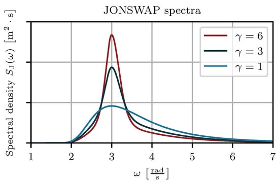 Therein, is the velocity potential, is the free surface elevation, and g is the gravity acceleration. The simulations were initialized using wave surfaces from the JONSWAP spectra [45] in the finite depth form [46].