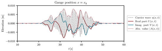 Example of an irregular carrier wave measured at one location inside the wave tank. The real and imaginary parts of its corresponding complex envelope are visualized, along with its absolute value .
