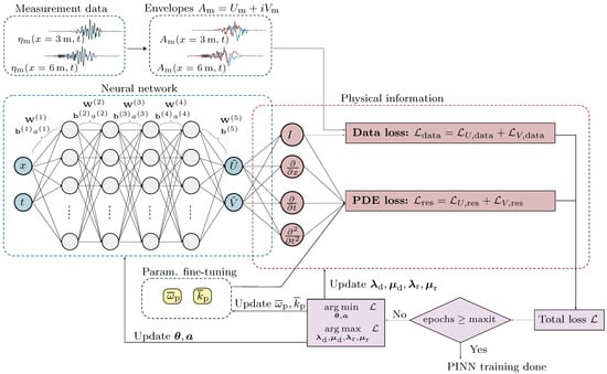 Moreover, over the course of our study (Section 3.2), we examined how the data-driven fine tuning of the NLSE coefficients (Equation (6)) while assimilating sparse measurement data affected the reconstruction quality. Given that all the coefficients in the NLSE were related to the peak wavenumber and frequency, we selected treating the coefficients’ base parameters and as additional PINN variables while sharing an optimizer with the neural network parameters and . This is visualized in the lower-left box of Figure 4.