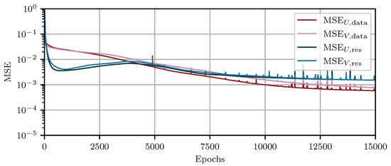 Exemplary NLSE-PINN training loss curve. The PDE residual error components and initially exhibited a strong decrease, but slightly increased as the data error components and were reduced. After around 10,000 epochs, the PDE residual errors reached a plateau, while the data errors continued to gradually improve.