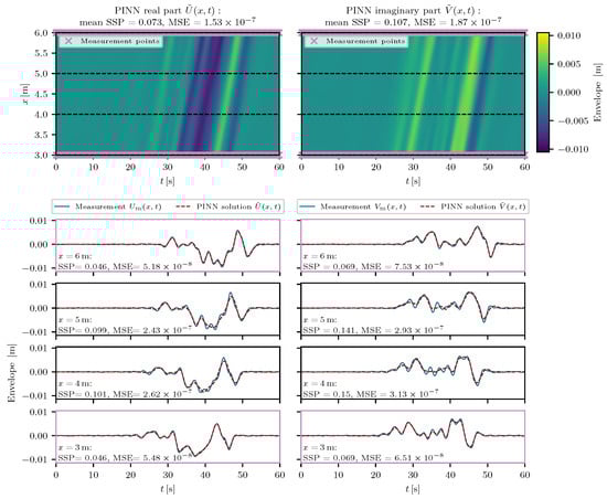 However, as our PINN loss function was constrained by the hydrodynamic NLSE associated with limitations in accommodating arbitrary irregular sea states due to the constraints in the bandwidth, steepness, and nonlinearity [1], we investigated the utilization of a slightly misspecified PINN for assimilating wave data derived from the more realistic HOSM; the HOSM also accounts for highly nonlinear, broad-banded, or directional sea states in non-breaking scenarios [42,43]. This misspecification acknowledges the common discrepancy between mathematical models (e.g., PDEs) and measurement data in complex, real-world physical systems [44], where perfect alignment between measurements and analytical solutions is uncommon, and exact knowledge of the physical equations that describe all phenomena encountered in measurements is rare. Moreover, an ongoing challenge in applying the NLSE to irregular waves with specific bandwidths lies in accurately determining its coefficients, which are derived from ratios of the base parameters of the carrier wave frequency and wavenumber . In particular, relatively short measurement intervals and slight deviations in the measurement data from the narrow-band assumptions of the NLSE can introduce uncertainties in the determination of and , which affect, for example, the propagation velocities, and thus, cause errors and offsets in the surface elevation reconstructions. Therefore, our hypothesis for this study was as follows: