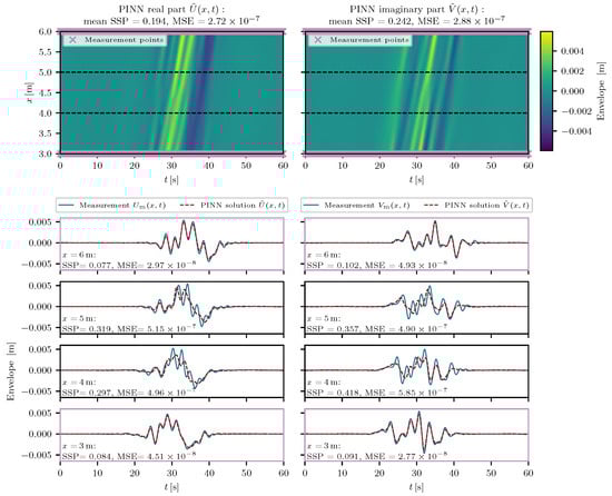 Figure 6 presents a reconstruction of the real part and imaginary part of an envelope above the carrier wave sample no. 1, with , , and . The PINN reconstructed a wave envelope structure across the entire computational domain, despite relying solely on measurement data from the boundaries marked in violet.