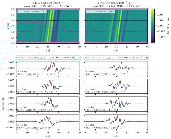 Despite providing only two time series of the analytical solution at the outer boundaries and for computing the data loss (Equations (14) and()), the PINN effectively reconstructed physically consistent Peregrine envelopes within the remaining computational domain solely with the aid of the PDE residual loss components (Equations () and ()). This is demonstrated in the lower subplots, where the time series of the PINN solution’s real and imaginary parts, and , are compared with the analytical solution, and , at the cross-section of five points in space. Notably, despite the lower envelope amplitudes at the domain boundaries, the PINN accurately reconstructed the higher peak in the real part in the middle of the domain. This underscores the NLSE-PINN’s efficacy to capture and calculate the underlying NLSE dynamics. Furthermore, this analysis revealed that the approximation errors attributable to the neural network were very small, where they averaged around × and in this instance. Hence, any encountered errors were more likely attributable to model misspecification between the NLSE-PINN and the HOSM wave tank measurement data than to approximation errors.