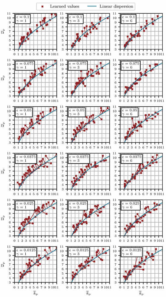 During the coefficient fine tuning, the peak frequency increased and the wavenumber decreased while training of sample no. 2 shown in Figure 9 and Table 1. In contrast, other samples displayed varied trends, such as concurrent increasing or decreasing and , or decreasing with increasing . Figure 11 illustrates this variability across all 630 samples according to their respective – combination. The initial and values aligned with the blue graph of the linear dispersion relation, while the fine tuned values mostly deviated from this relation, as indicated by red crosses. The left and middle columns of this Figure reveal that medium- and broad-banded sea states ( and ) tended to benefit from – combinations above the linear dispersion relation. This suggests that increased group velocities enhanced the reconstruction quality. In contrast, narrow-banded samples () showed learned combinations both above and below the linear dispersion curve, which reflected that the neural network effectively reduced the uncertainties in the initial determination of .