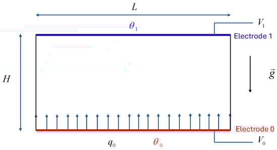 We consider an incompressible and perfectly insulating liquid of density ρ, permittivity ε, the ionic mobility K, constant kinematic viscosity υ and constant thermal diffusivity κ, enclosed between two parallel planar electrodes of length L. The liquid layer of depth H is subjected to a potential difference ΔV = V0 − V1 and a thermal gradient (see Figure 1).