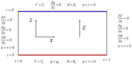 The boundary conditions on velocity, temperature, electric potential, and charge density are chosen, as shown in Figure 2. On the horizontal and lateral walls, we apply no-slip boundary conditions. We consider here the fluid initially at rest with simultaneous heating and injection at t = 0.