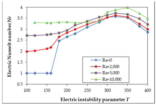 It can be seen that the Ne number does not depend significantly on the Ra number for high enough values of T. We have already demonstrated a similar behavior for the Nusselt number (Nu) in Refs. [,]; for large values of T, the electrical forces dominate the buoyancy forces. In the case of pure EC, when T < Tc (Tc = 163.4 []), the perturbation does not trigger the flow instability; the perturbed flow reverses to the hydrostatic state. If T decreases after the EC vortices are formed, they are maintained until T = Tf (Tf = 108.5 []), when the system returns to the hydrostatic state. As soon as T is greater than Tc (T > Tc) there is a sudden jump in the Ne for EC due to the motion of the liquid initially at rest, with a maximum velocity that exceeds the ion drift velocity. For ETC, when T < Tc we observe greater values for the Ne, which can be explained by the non-linear coupling phenomena between the buoyancy and Coulomb forces; the motion of the liquid induced by thermo-convection drags more electric charge and then causes an increase in the electric current. This means that the increase in the electric Nusselt number Ne is due to thermo-convection. For Ra = 2000 and T > 300, the Ne values are close to the ones obtained in the case of pure EC. At Ra = 10,000 the situation is different; in the initial stage, the flow is thermo-convective with a two-roll structure, (it does not change), but later, at high values of T (T > 280), it changes drastically. There is a jump, and it becomes an electro-thermo-convective flow structure with four rolls.