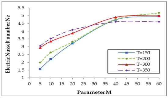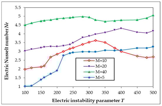 In Figure 6, the variation of the electric Nusselt number Ne with M is presented for different values of the instability criteria T. We can see the fast linear growth of Ne, which is similar to the results obtained in Ref. [].