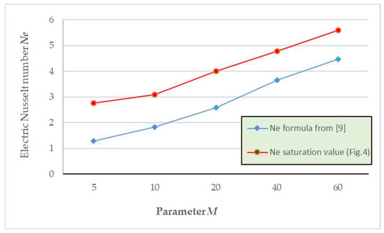 Electric Nusselt number Ne for several values of M; curve in blue corresponds to formula (6) []; Ne values of the red curve are taken at the saturation point of Figure 5.