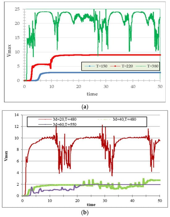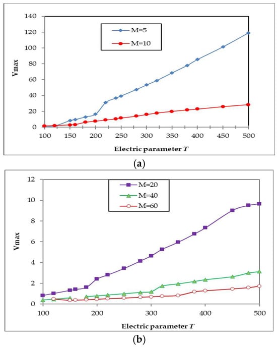 Figure 8 presents the bifurcation diagram for thermo- and electro-convection expressed with the maximum fluid velocity in the bulk Vmax versus T for different values of parameter M. Initially, Vmax increases slowly with T. Then, for certain values of T, the slope of the curve changes and continues to increase. The change in slope depends on the values of M and corresponds to the transition from thermo- to electro-convection. For smaller values of M (M = 5 and M = 10, see Figure 8a), the values of Vmax are much higher than for the other represented M (see Figure 8b), but the behavior of the curves is similar.
