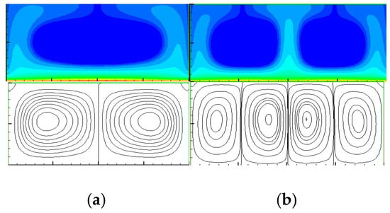 Distributions of charge density and stream function at a steady convective state for Ra = 2000, Pr = 10: (a) T = 200 with two thermo-convective rolls; and (b) T = 220 with four electro-convective rolls.