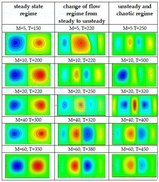 Figure 9b depicts the evolution in time of the maximum velocity magnitude at different settings of the driving parameters M and T corresponding to the values at which the slopes of the curves change (see Figure 8). The evolution of peak velocity Vmax also experiences two different stages after the initial disturbance. The first one is the exponential growth stage, which is the same for the smaller values of T (see Figure 9a). However, the second stage is quite different; Vmax grows rapidly, the flow becomes strongly unsteady and looks chaotic. In simpler terms, the flow transitions from a stationary state to a thermo-convective flow, followed by an electro-convective flow, and eventually reaches a chaotic state once the system loses its linear stability. This means that the system with high T is essentially in the inertial state of motion. Due to the electric force and destabilizing buoyancy force, the system exhibits electro-thermo-convective vortices and transitions to a chaotic flow field, where the flow fluctuates irregularly in time.