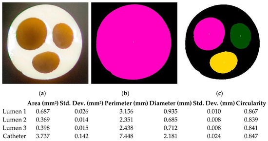 To accurately determine the area and diameter of each lumen, the catheter was dissected and a macro photograph of the diameter section of the device was obtained (Figure 1). The image was later processed with the open-source program ImageJ, version 1.54j [55].