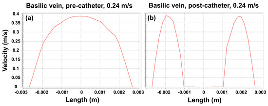 The influence of the catheter on the blood flow from the basilic vein to the vena cava was examined, studying two different blood velocities: 0.24 m/s and 0.15 m/s with and without the presence of the catheter. The blood velocity values were selected through the results of a Doppler ultrasound provided by the Arnau de Vilanova University Hospital in Lleida and contrasted with studies and medical articles, cited in the bibliography [36,37,38,39].