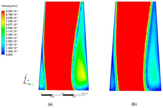 - The variation in blood velocity has no significant effects on the distribution of blood throughout the system. The phenomena of vorticities, fluid-tight zones and irregular distributions remain undifferentiated at both blood velocities, although it can be noted that the reduction in velocity implies a lower Reynolds number and therefore a slight increase in blood laminarity.