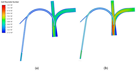 CFD is a methodology that mathematically predicts the flow of physical fluids using computational tools. It solves the equations derived from the fundamental laws of conservation of the physical properties of fluids. Laminar flow is the type of movement of a fluid when it is perfectly ordered and stratified, so that the fluid moves in parallel layers without mixing. Turbulent flow occurs when movement becomes more irregular, chaotic and unpredictable, the particles move in a disorderly manner and the trajectories of the particles form small and aperiodic vorticities [12]. The Reynolds number is the relationship between the inertia forces and the viscous forces of a fluid. It is a dimensionless parameter used to classify fluid systems in which viscosity is considered. If the Reynolds number is less than or equal to approximately 2000, this indicates laminar flow, and a higher Reynolds number indicates turbulent flow [13]. The Reynolds number is computed by using Equation (1).