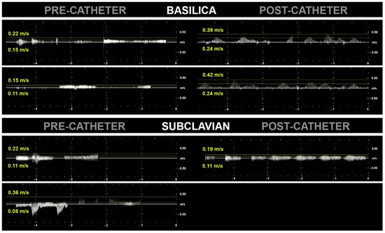 Doppler ultrasound is based on the fact that the frequency of sound changes when the emitter and/or receiver move. It is used to evaluate blood flow by measuring the movement of red blood cells, allowing us to obtain information regarding vascular permeability, flow direction, presence of stenosis, distal vascular resistance and vascularization of lesions [11]. In a Doppler study, many factors arise that limit the accuracy of the ultrasound. One important factor that affects the results obtained is venous distensibility; because of the vein’s anatomy, when inserting a device inside (such as a catheter), it may dilate. On the other hand, due to this anatomical feature, the presence of the ultrasound scanner (which applies pressure on the blood vessel) has effects on the theoretically circular shape and, therefore, causes interference in the measurement of the vessel’s diameter.