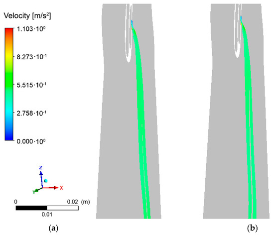 Figure 18 represents the path of parenteral nutrition particles from the medial lumen to the end of the vena cava. In both cases, it was observed how the fluid left the medial lumen in the final direction of the lumen, and then joined the bloodstream following the direction of the blood. The trajectory described was almost parallel to the wall of the venous tube. In both figures, it can be seen how the fluid bifurcated approximately halfway through the journey. In Figure 18a, which corresponds to the simulation with the highest inlet velocity into lumen 3, nutrition was divided later, that is, when the particles travelled the longest. In Figure 18b, on the other hand, it was observed that the particles split their trajectory before the middle of the journey. Therefore, it could be concluded that the faster the particles of the blood environment move, the less noticeable was the branching of fluid that occurred in the medial lumen.