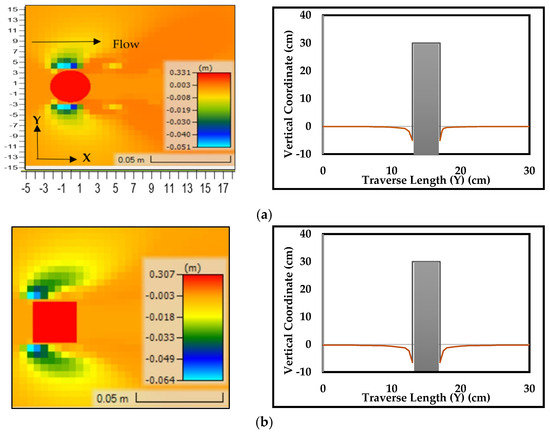 The investigation establishes a simple situation where a solitary pier is situated, preserving the hydraulic environment’s original nature. Figure 8a–g present a comprehensive depiction of the morphologies in both the longitudinal and transverse directions, carefully examining the degraded regions surrounding the bridge piers, which illustrates seven distinct pier shapes—cylindrical, square, oblong, ogival, elliptical, rectangular, and diamond—where each preserves comparable dimensions and is exposed to identical discharge rates and existing hydrodynamic conditions. These illustrations depict the calculated depth of the scour hole formed by multiple testing circumstances. The varied layouts of the bridge piers substantially alter the principal scour zones downstream and the general shape of the impacted area. The square-shaped pier exhibits the deepest erosion, with a maximum depth of 6.4 cm at its upstream edge. In contrast, the elliptical-shaped piers, measuring 3.8 cm, demonstrate the least erosion, with a maximum depth of scouring, primarily concentrated at the diverging intersection of its sides. The diamond-shaped piers show a maximum erosion depth of 6.2 cm, with the scour evenly distributed along both edges. Cylindrical and rectangular piers, both with an erosion depth of 5.2 cm, exhibit their deepest scour at the upstream face. Similarly, the ogival shape has an erosion depth of 4.4 cm, while the oblong shape displays 4 cm of scouring. This suggests that square and cylindrical shapes are more vulnerable to erosion upstream, while the elliptical and diamond shapes show more complex erosion patterns.
