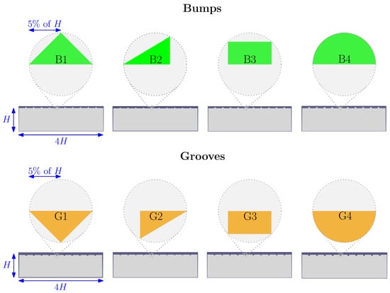 Types of roughness and visualization of their implementation. Bumps are referred to as B1–B4, while grooves are referred to as G1–G4. Each of them spans the cylinder in the spanwise direction.
