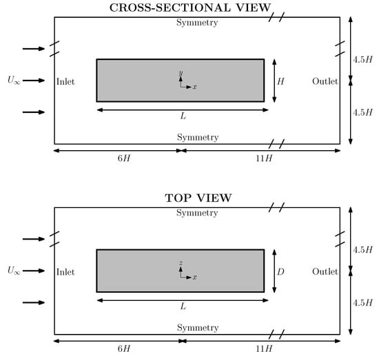 The computational domain is shown in Figure 2. The origin of the global Cartesian system is located at the center of the cylinder and the flow runs parallel to the x-axis. Inflow and outflow boundaries were defined at and , respectively. In turn, symmetry boundaries were implemented in the front and back and up and down limits, located at , and , respectively. The walls of the cylinders abided by the non-slip boundary condition.