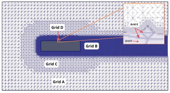 The mesh contained a mix of structured and non-structured grids, which can be seen in Figure 3. The coarsest grid denoted a uniform-structured section tagged by Zone A, conformed with quasi-cube cells with an approximate volume of 1 , i.e., per side. Zone A was constructed with the blockMesh tool in OpenFOAM, while the rest of the grids were constructed by means of the SnappyHexMesh tool. Zone B also consisted of a uniform-structured grid but with higher refinement for capturing flow effects in the wake more accurately. The grids enclosing Zones C, D, and E were designed to further refine measurements when approaching the cylinder, with all of these planned to be non-structured. Zone E encloses the finest grid consisting of the cells intersected by the cylinder edges, allowing us to capture the geometry of the grooves and the bumps with an approximate resolution of ; in turn, Zone D was formed of cells that defined the imported STL-geometry, while Zone C was a scaled volume that diminished resolution while spanning from the ending of Zone D to a radial distance from the cylinder’s walls; it also matched the refinement of Zone B at from the walls. The referred software built the mesh in a way that, when two different refinement levels were superposed, the higher one was implemented. A space of one cell (of the lower level) was left at the transition between refinement levels.