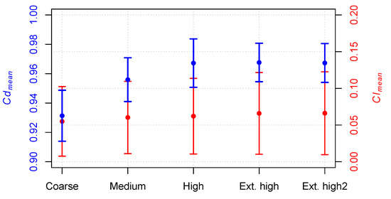 Time-averaged coefficient values for different mesh arrays and their standard deviation with error bars for drag (blue) and lift (red).