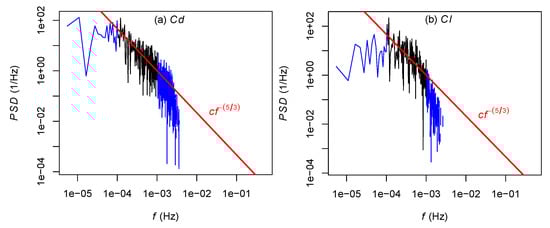 Log–log plot of the auto-scaled power spectral density of (a) drag and (b) lift series of the case B4 using the Ext. high mesh. The inertial range is approximated in black. Negative values are omitted due to the logarithmic transformation. Kolmogorov’s scaling law is plotted in red, considering a constant for both series.