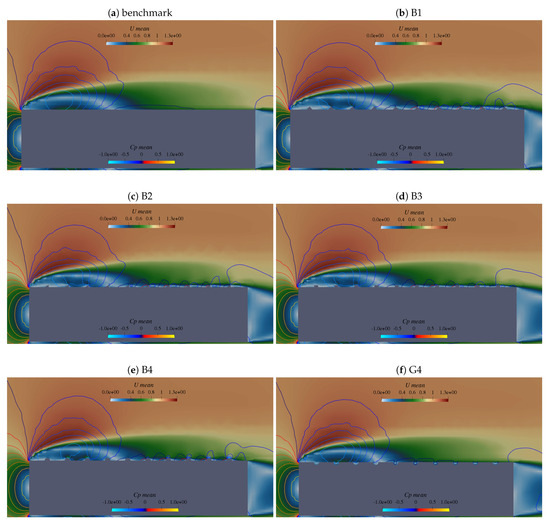 On a smaller scale, around the modified surface topology, it is also observed that the presence of bumps caused larger, perhaps more interesting, disturbances to the flow than the induced grooves. The latter fold the near-zero contour lines inside the six rear grooves. In contrast to this, it is worth highlighting an up–down effect on pressure that became particularly visible around the last five bumps. For triangular cases (B1 and B2), high-pressure zones (red contours) are located before every bump, while low-pressure zones (blue contours) clearly developed around their rear, which was assumed to be related to a softening flow separation. In turn, for the squared and circular cases (B3 and B4), high pressures share the front of each bump with zero-level pressures (dark contours), while very low pressure contours predominate on the exact position and rear side of the bumps. Contrasting with triangular cases, this observed transition of pressure zones suggests a quick flow separation caused by the bluff shape of the bumps.