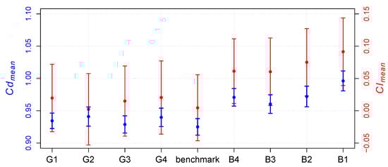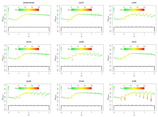 Figure 9 shows a different perspective regarding the small and large disturbances observed in the mean aerodynamic coefficients and . No geometrical change reduced drag with respect to the benchmark. The grooves caused slight increments of no more than 1%, whereas higher increments ranging from 4% to 8% were reached in the presence of bumps, namely 4% (B3), 5% (B4 and B2), and 8% (B1). Similar effects are seen for the lift coefficient. increases by less than 0.02 units for groove cases, while it increases by 0.06 units for B3 and B4, 0.07 for B2, and 0.08 for B1. In this figure, error bars are also plotted to compare the standard deviation calculated for the four coefficients. These results do not show a dependence on geometrical modifications: all values vary between 1.5% and 2% of the -benchmark value, while the values fluctuate by about 0.1 units. The side force is not shown but there are no significant disturbances there due to the main flow being aligned with the x-direction.