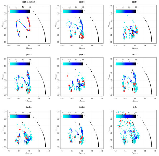 Figure 10a, corresponding to the benchmark, exhibits the most regular pattern between and ; it resembles a sigmoid curve. In this case, decreases as increases and vice versa, except in between the inflection points around (around the second wrinkle) and (between the fourth and fifth wrinkle). The coordinates X of these inflection points match the inflection points of observed in Figure 8a. These points define three distinguishable clusters in Figure 10a: the mean velocity increases before the first inflection point and after the second one, while it decreases at the intermediate X-coordinates. Therefore, inversely mirrors the behavior of for the benchmark. In Figure 10b,d,f,h, corresponding to grooved cylinders, the clusters limited by the inflection points can also be identified. In these cases, the mean velocity decays around the grooves, taking values around for G1 and G2 (except in the 10th groove in G2) and around for G3 and G4. The patterns observed replicate across the tested groove geometries, and the variability inside each cluster is roughly the same; thus, we conclude that the forms in each of these plots correspond to the sigmoid curve of the benchmark, disarranged by the grooves. This observation is supported by the results observed in Figure 8 for the domain. In the case of the latter, corresponding to Figure 10c,e,g,i, the sigmoid curve is altered to a higher degree. In this case, the clusters induced by the inflection points can also be identified, but they overlap. Despite this, the location of points in blue indicates that the velocity–pressure relationship is similar for all of these geometries in the flat and bumped zones, except for B4. It is worth noting that the mean velocity in the bumps is highly unsteady, with values of for – and for . Notably, the case shown in Figure 10i, for the geometry , indicates that circular bumps induce the most chaotic behavior in the flow. Therefore, in spite of , the presence of wrinkles produces lower values of compared to the benchmark.