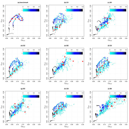 Time-averaged scatter plots of vs. U for nine cases. Benchmark (a). Grooves (b,d,f,h). Bumps (c,e,g,i). Time-averaged values of are indicated by the color scale. Points corresponding to wrinkles are not highlighted due to no significant behavior being found.